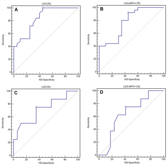 The percentage of LDG was characterised by 100% of sensitivity and 55% of specificity (AUC = 0.84; p < 0.0001), while the percentage of MPO-expressing LDG was characterised by 92% of sensitivity and 55% of specificity (AUC = 0.78; p = 0.0001) in detecting AIH (Table 2, Figure 5A,B).