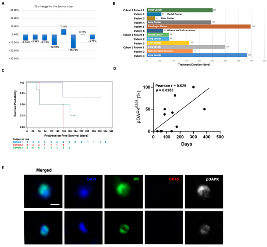 (A) Waterfall diagram showing changes in tumor size in target lesions in eight patients who achieved SD. (B) Treatment duration of each patient. (C) Overall survival of the patients. (D) Correlation of proportion of pDAPK + CTC numbers with treatment duration. (E) Immunofluorescence staining of representative circulating tumor cells obtained from patients. Cancer cells fulfilled criteria for CTCs, including: CK−positive (green), CD45−negative cells (non-red), and nucleated (blue). Scale bar = 5 µm.