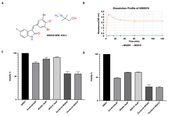 The PK data from this study indicated that MG005 has a significantly shorter half-life when compared to sorafenib. The PK data showed that MG005 has a low bioavailability, which limits further evaluation of its efficacy at a higher dosage. Meanwhile, MG005 was also found to have poor absorption, as increasing the dosage from 750 mg QD to 1500 mg QD did not result in a significant increase in the bioavailability of GW5074 in patients. To overcome the challenge of poor bioavailability and to further evaluate the efficacy of MG005, a new oral formulation, i.e., MG010, has been developed (Figure 3A). MG010 showed a significant improvement in solubility compared to MG005, the non-salted GW5074 (17.6:1 at 60 min; Figure 3B).
