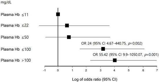 | Plasma Hb > 50 mg/dL | 2.43 (1.39–4.25) | 0.002 | 2.12 (1.18–3.78) | 0.012 |