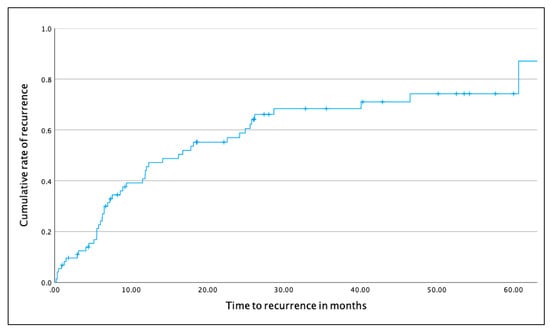 Kaplan–Meier survival curve showing the cumulative rate of recurrence over time (data censored at 60 months).