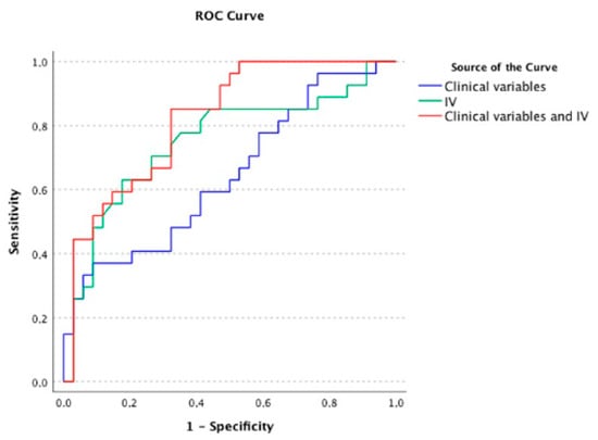To generate the ROC analyses, we excluded eight participants with no recurrence before the median duration of 18 months. As shown in Figure 2 and Supplementary Table S5, we found that clinical variables alone were relatively poor at identifying individuals at risk of early vs. late recurrence (AUC = 0.64, 95% CI: 0.50–0.78). In contrast, IV alone correctly classified 75% of participants with early vs. late recurrence (AUC = 0.75, 95% CI: 0.62–0.88) and the classification was marginally improved when IV was combined with key clinical variables (AUC = 0.82, 95% CI: 0.72–0.92). Statistical analyses of the differences between the AUC demonstrated that the incremental improvement in correct classifications achieved with the IV plus clinical variables model (as compared with clinical variables alone) was of borderline significance (p = 0.04).