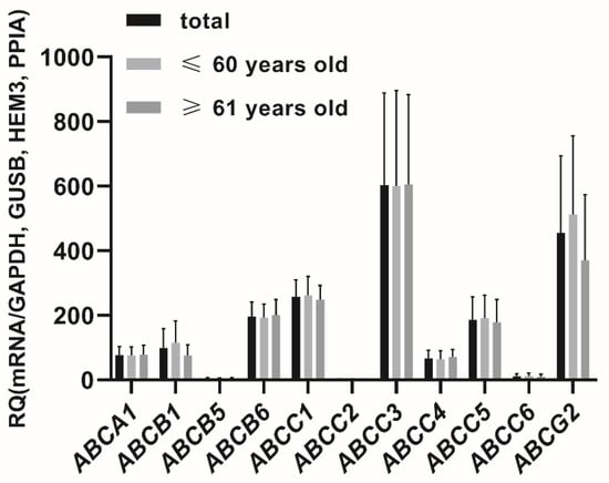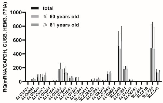 Age-dependent significant differences in the expression levels, stratifying the studied population as up to 60 (57.3 ± 2.78) and over 60 (67.8 ± 4.9) years of age, were evidenced for ABCB1 and ABCG2 as well as SLC04C1, SLC15A1, SLC16A1, SLC22A11, SLC22A18, SLC47A1 and SLC47A2 (Figure 3 and Figure 4). All other studied transporters did not demonstrate age-dependent changes.