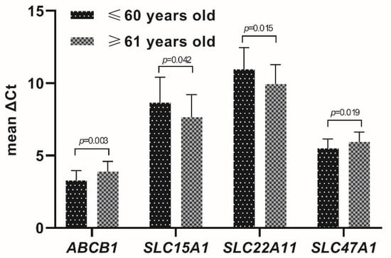 The selected transporters with significant age-dependent differences in the expression levels. X: Abbreviations of the examined ABC transporters and SLC superfamilies. Y: ΔCt mean values (±SD). Significance values: ABCB1 p = 0.003; SLC15A1 p = 0.042; SLC22A11 p = 0.015; SCL47A1 p = 0.019.