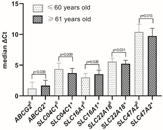 The selected transporters with significant age-dependent differences in the expression levels. X: abbreviations of the examined ABC transporters and SLC superfamilies; # ≤60 years old, * ≥61 years old. Y: ΔCt median values (IQR). Significance values: ABCG2 p = 0.039; SLC04C1 p = 0.009; SLC16A1 p = 0.028; SLC22A18 p = 0.031; SLC47A2 p = 0.013.