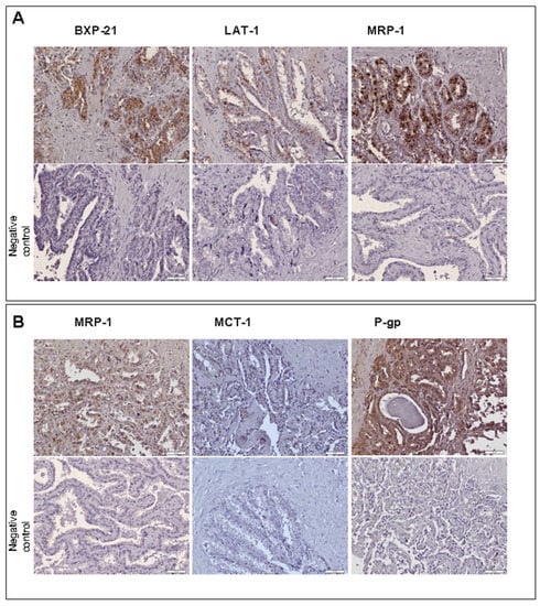 IHC expression and localization of transporters in seminal vesicles samples. Panel (A): upper line—BCRP, LAT1, MRP3 expressions in seminal vesicles tissue samples; lower line—negative control slides (without primary antibodies). Panel (B): upper line—MRP1, MCT1, P-gp expression in seminal vesicles tissue samples; lower line—negative controls. Original magnification ×200, scale bar 50 μm. Only representative images are included.