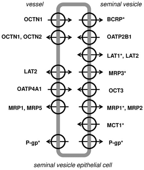 Membrane transporters in the human seminal vesicle epithelial cell (hypothetical distributions of the examined transporters). (*) Transporters immunolocalized in the present study. Putative localization of other transporters based on their functional role from literature data. BCRP—breast cancer resistance protein; LAT1, LAT2—L-Type Amino Acid Transporter 1, 2; MCT1—Monocarboxylate transporter 1; MRP1 MRP2, MRP3, MRP5—multidrug resistance-associated protein 1, 2, 3, 5; OATP2B1, OATP4A1—organic anion-transporting polypeptide 2B1, 4A1; OCT3—organic cation transporter 3; OCTN1, OCTN2—organic cation and carnitine transporter 1, 2; P-gp—P-glycoprotein.
