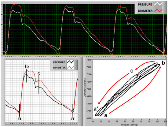 Upper panel: original tracings of carotid diameter (red line) and simultaneously acquired blood pressure (white line) wave. Lower panel: on the left arterial pressure wave (black line) and curves of cross-sectional diameter changes (red line); a–b interval indicates the proto-mesosystolic phase, and c–a’ is the late diastole phase (lower panel). Cross-sectional diameter/pressure curves are shown in the right lower panel.