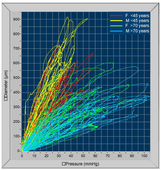 Carotid cross-section pressure curves in individuals aged 20–45 years (red lines, females; yellow lines, males) and over 70 years old (green lines, females; blue lines, males).