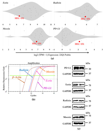 Expression profiles of ezrin, radixin, moesin (ERM), and programmed death ligand-1 (PD -L1) at mRNA and protein levels in HEC-151 cells. (a) Violin plots showing the median gene expression (log2 (TPM + 1)) of ERM and PD-L1 in numerous human endometrial cancer cells obtained from the Cancer Dependency Map (DepMap) portal data explorer, DepMap 22Q1 Public. (b) Amplification curves for each target gene in HEC-151 cells, as measured by real-time reverse transcription–polymerase chain reaction. (c) Immunoblot images of each protein in HEC-151 cells. Upper panels; ezrin, radixin, moesin, and PD-L1, lower panels; corresponding glyceraldehyde-3-phosphate dehydrogenase (GAPDH) shown in duplicate. Molecular weights; kDa.