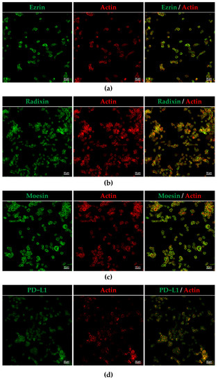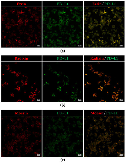 Confocal laser scanning microscopy (CLSM) analysis was performed as described previously, with some modifications [27,29]. Single and double immunofluorescence staining were performed to determine the intracellular localization of ezrin, radixin, moesin, and PD-L1, or the colocalization of PD-L1 with ezrin, radixin, and moesin, respectively.
