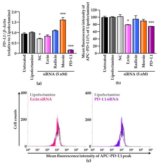 Effects of RNA-mediated interference of ezrin, radixin, and moesin on the expression of programmed death ligand-1 (PD-L1) in HEC-151 cells. (a) Relative mRNA expression of PD-L1 normalized with β-Actin was determined via a reverse transcription–polymerase chain reaction. n = 3, *** p < 0.001, * p < 0.05 vs. Lipofectamine. (b) The mean fluorescence intensities of allophycocyanin (APC)-labeled PD-L1 relative to Lipofectamine alone; n = 3, *** p < 0.001, * p < 0.05 vs. Lipofectamine. (c) Histograms for APC-labeled PD-L1 fluorescence in the surface of HEC-151 cells treated with Lipofectamine (gray), ezrin siRNA (red), and PD-L1 siRNA (purple), as measured by flow cytometry. All data were expressed as the mean ± SEM and analyzed by one-way ANOVA followed by Dunnett’s test. Nontargeting control; NC.