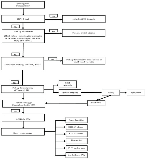 - Tomaras, S.; Goetzke, C.C.; Kallinich, T.; Feist, E. Adult-Onset Still’s Disease: Clinical Aspects and Therapeutic Approach. J. Clin. Med. 2021, 10, 733. [Google Scholar] [CrossRef] [PubMed]