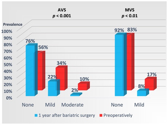 Prevalence of AVS and MVS preoperatively and 1 year after bariatric surgery. p values of significance for reduction in AVS and MVS after surgery, respectively.