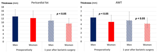 Diabetic and hypertensive patients, as well as those with higher preoperative BMI (> the preoperative median of 41.5 kg/m2) experienced less reduction in pericardial fat thickness and AWT. Men retained a significantly thicker pericardial fat layer and AWT than women after surgery (Figure 2), while patients with preoperative BMI > 41.5 kg/m2 had less improvement in MVS (p < 0.05).