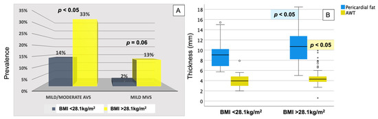 One-year postoperative AVS and MVS (percentages, panel (A)), and pericardial fat thickness and AWT (in mm, data presented as boxplots in panel (B)) in patients with lower vs. higher than the median achieved BMI of 28.1 kg/m2. p values of significance for comparison of each marker of atherosclerosis between the two groups.