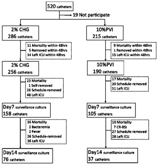 The skin surrounding insertion sites is believed to be the main source of infection when catheters are placed for shorter durations [10]. Therefore, along with bundle intervention, the use of an optimal skin antiseptic agent in catheter insertion and maintenance is crucial in the prevention of CRBSIs. Several studies have demonstrated that chlorhexidine gluconate (CHG) solution provides better effectiveness in decreasing the incidence rate of CRBSIs compared to 10% povidone-iodine (PVI) solution, either with peripheral venous catheters, central venous catheters (CVCs), or arterial catheters [11,12,13,14,15]. However, these studies had several methodological drawbacks that meant the general application of their findings was limited. Furthermore, few studies have compared the efficacy of the two antiseptic agents regarding the inhibition of the growth of skin flora over catheter insertion sites.