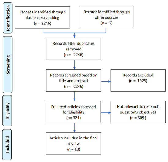 A total of 2246 relevant articles were identified and screened for eligibility. Two studies were ruled out for multiple publications with identical data made by the same author [2,15]. From titles and abstracts, 321 articles were selected for a full-text review, among them, 11 fulfilled inclusion criteria. The reviewers extracted two more studies from article references [18,19], totaling 13 studies [3,18,19,20,21,22,23,24,25,26,27,28,29] at the end of the screening (Figure 1).