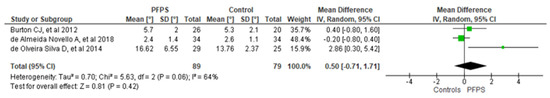 The rearfoot eversion range of motion (ROM) was the most measured variable [3,18,26,28] (Figure 2). De Oliveira Silva et al. [26] found a significantly higher ROM in PFPS than the control group (16.66 ± 6.55 vs. 13.76 ± 2.37), while Barton et al. [28] and Novello et al. [3] found no difference. No association was found after pooling (MD 0.50; 95% CI −0.70 to 1.71) (Figure 3). Moreover, Luz et al. [18], and Barton et al. [28] found an association between peak rearfoot eversion and peak tibial internal rotation and peak femur adduction, greater in the first group than in the second, but no difference in kinematic between PFPS and control group.