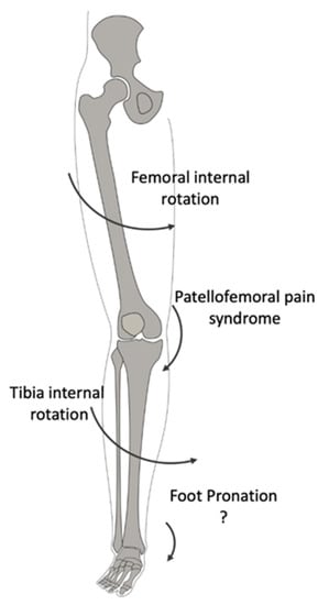Barton et al. [28] and Luz et al. [18] highlighted the association between peak rearfoot eversion, peak tibial internal rotation, and peak femur adduction, while de Oliveira Silva et al. [26] reported greater rearfoot eversion ROM in PFPS patients than the control group. In addition, Aliberti et al. [20] reported an increased medial-to-lateral roll-over of the foot during gait. These data may support a previous belief that prolonged or excessive foot pronation [32] does not permit the tibia to externally rotate during extension of the limb, thus leading to a compensatory excessive internal rotation of the femur. This movement lateralizes the patella, thus causing its mal-tracking. Based on this assumption, the excessive pronation of the subtalar joint was historically identified as a risk factor for a dysfunctional biomechanical mechanism of the lower limb, leading to kinematics adaptation of the other joints (Figure 4).