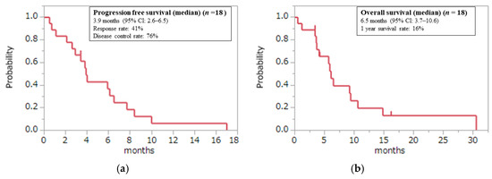 The effect evaluation by the image was possible with 17 patients. PR was observed in 41%, and 35% of patients achieved stable disease (SD); the response rate (RR) was 41% and the disease control rate (DCR) was 76%. The median follow-up time was 5.8 months (range: 0.5–30.5 months) among censored cases. The median PFS was 3.9 months (95% confidence interval (CI), 2.6–7.7), the median OS was 6.5 months (95% CI, 3.7–10.6), and the 1-year survival rate was 16.7% (Figure 1).