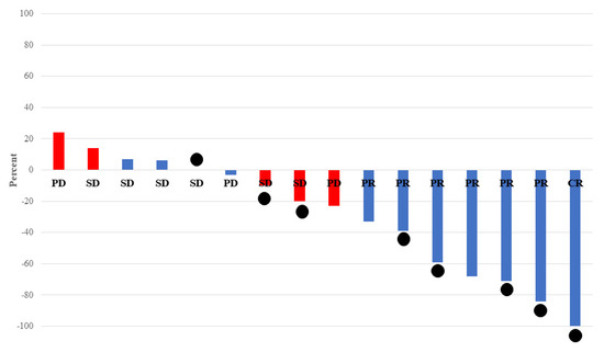 Best rate of change from baseline in total measurable tumor diameter. Blue: Prior use of ICI (n = 10): (RR: 60%), Red: no prior use of ICI (n = 6): (RR: 14%), ●: Tmab-free interval over 8 months (n = 8): (RR: 75%).