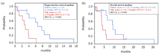 Eleven patients (61%) had peritoneal dissemination, whereas eight patients (44%) had ascites. PFS (6.5 vs. 2.75 months, p = 0.0139) and OS (9.4 vs. 3.9 months, p = 0.0460) were shorter in patients with ascites than in patients without ascites (Figure 4). Further, a decrease in ascites was observed in 25% of the patients with ascites after T-DXd administration.