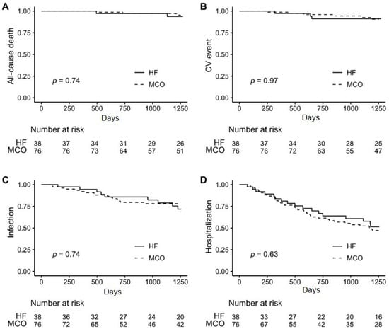 We investigated the clinical outcomes, including all-cause death, cardiovascular events, infections, and hospitalizations, in the retrospective cohort according to the membrane used. During the three-year study period, there were five deaths (two in the HF group and three in the MCO group, p = 0.74), nine CV events (three in the HF group and six in the MCO group, p = 0.97), 25 infection events (nine in the HF group and 16 in the MCO group, p = 0.74), and 55 hospitalizations (17 in the HF group and 38 in the MCO group, p = 0.63). There were no significant differences between the two groups in the occurrences of these four clinical events (Figure 1).