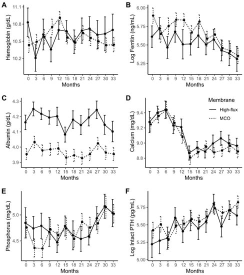 Changes of laboratory findings during the three-year treatment period according to the membrane type. The average values of the laboratory parameters including hemoglobin (A), ferritin (B), serum albumin (C), total calcium (D), phosphorus (E), and intact PTH (F) are shown. Data are presented as arithmetic means (black dots) and standard errors (error bars) as an error bar plot. The values of the high-flux group are represented as solid lines, and those of the MCO group as dash lines. Ferritin and intact PTH values were log transformed. MCO, medium cut-off membrane; PTH, parathyroid hormone.