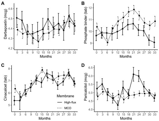 Changes in medication usage during the three-year treatment period according to the membrane type. The average monthly doses of darbepoetin (A), phosphate binders (B), cinacalcet (C), and paricalcitol (D) are shown. Data are presented as arithmetic means (black dots) and standard errors (error bars) as an error bar plot. The darbepoetin and paricalcitol doses are expressed in microgram units. The amounts of phosphate binders and cinacalcet are expressed in tablet numbers. The values of the high-flux group are represented as solid lines and those of the MCO group as dash lines. Darbepoetin doses were log transformed. The quantities of phosphate binder, cinacalcet, and paricalcitol were square-root transformed. Phosphate binder included calcium carbonate, calcium acetate, and sevelamer. MCO, medium cut-off membrane.