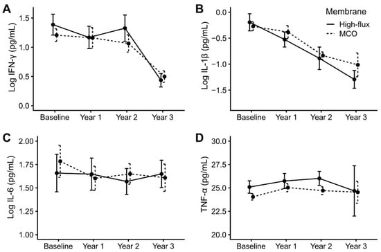 Changes in cytokine concentrations during the three-year treatment period according to the membrane type. The mean values of cytokines during the study periods are presented: (A) interferon-γ, (B) interleukin-1β, (C) interleukin-6, (D) tumor necrosis factor-α. Data are presented as arithmetic means and standard errors as an error bar plot. The values of interferon-γ, interleukin-1β, and interleukin-6 were logarithmically transformed. The values of the high-flux group are represented as solid lines and those of the MCO group as dash lines. MCO, medium cut-off; IFN interferon; IL, interleukin; TNF, tumor necrosis factor.