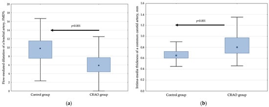 The relative increase in flow-mediated dilatation of the brachial artery (a) and mean values of intima-media thickness of the common carotid artery (b) in controls and CRAO patients. Data are presented as median, interquartile range, and maximum and minimum values. The numbers on the graph represent p-values compared with the control group.