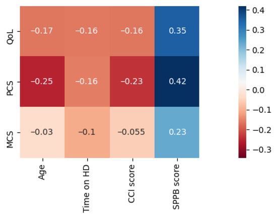 The QoL score was unrelated to gender (p = 0.213), age (p = 0.157), or HD vintage (p = 0.156). On two instances, the scores of individual domains were significantly associated with these variables: women scored lower in the role—emotional domain (M = 83.33, 58.33–100.00; F = 66.67, 33.33–83.33; p = 0.026), while the physical functioning domain showed a weak inverse correlation with age (p = 0.0017, R = −0.355). Interestingly, the time on HD was inversely correlated with the health change scores (p = 0.010, R = −0.294).