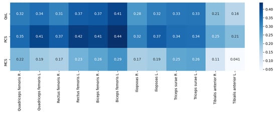 All muscle groups, except for the left and right tibialis anterior, showed weak to moderate positive correlations with QoL (Figure 2). All, except for the left tibialis anterior, correlated with the PCS; the strongest correlations were found with the biceps and quadriceps femoris. The strength of several muscle groups positively correlated with MCS as well. The strength of all muscle groups showed weak to moderate positive correlations with the SPPB score (R from 0.335 to 0.580; p < 0.05).