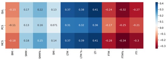 Overall, QoL, PCS, and MCS scores correlated positively with lean tissue parameters but inversely with fatty tissue parameters (Figure 3). Percentage of lean tissue mass showed positive correlations with several SF-36 domains: physical functioning, role–physical, bodily pain, vitality, role—emotional, and mental health (R from 0.239 to 0.363, all p < 0.05); the percentage of muscle mass correlated with role—emotional and vitality (R = 0.293 and 0.235, p < 0.05). The percentage of fat tissue mass showed inverse correlations with not only role–physical but also with role—emotional, vitality, and mental health (R from −0.240 to −0.333; all p < 0.05). There was no significant correlation between QoL, PCS, or MCS and patients’ BMI, weight, and OH%.