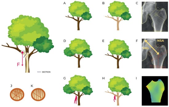 Simplification of the strain on the femur in a standing position or while walking comparing it with a tree with a force F acting on a branch. (A,B) describe the same branch with different material density (as inferred by BMD DXA scan represented in (C)); (D,E) describe the branches of the same material with different shape (as described by geometry parameters HSA and HAL in (F)); (G,H) describe different branches in different load situations (femurs with different BMD, different geometry and different applied load as represented in femoral BSI analysis in (I)); (J,K) describe different inner structures (concept similar to TBS even though TBS doesn’t apply to femur region).
