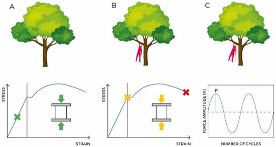 Using the same comparison example between a femur and a tree branch, in Figure 2, it is possible to understand the impact of different loads applied to a structure. Indeed, probably fracture risk is different under certain physiological conditions (stress/strain within the linear elastic acceptable range), in the case of overload (stress/strain near or beyond the mechanical limit described by yield point), or again in the case of repeated stress.