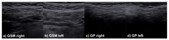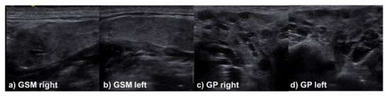 Case of a female patient, 52-year-old at the time of diagnosis, presenting with a mediastinal lymphadenopathy as an initial sign of sarcoidosis. Despite having no complaints in the area of the salivary glands at baseline (no enlargement, pain or xerostomia), all salivary glands (GSM = submandibular gland, GP = parotid gland) are inhomogeneous with hyperechogenic bands, similar to Sjögren’s syndrome.