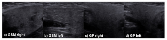 In the sonographic assessment of the salivary glands, there was also no clinically relevant difference in the assessment of the glandular parenchyma between patients with and without initial salivary gland affection for the modalities used at the time of follow-up (Table 4)—only in the acoustic radiation force impulse-based methods was a tendency towards higher values in the group with former salivary gland affection observed. Accordingly, it can be assumed that sarcoidosis does not lead to any permanent intraglandular damage or characteristic sonographic changes. Selected cases, including different appearances of the major salivary glands during the sonographic examination, are presented in Figure 1, Figure 2 and Figure 3.