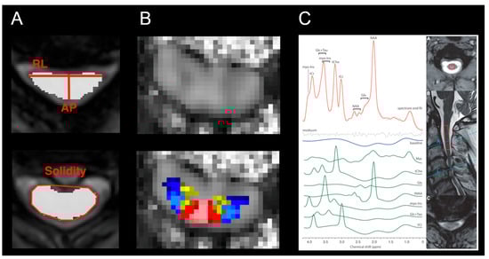 Figure 1. Quantitative MRI (qMRI) markers, derived using various qMRI methods. (A) Morphometric metrics measuring the degree of spinal cord compression, based on structural MRI. Upper panel shows compression ratio calculated as a ratio between the anteroposterior (AP) and transverse (RL) diameters, and lower panel shows solidity calculated as a ratio of cross-sectional area to the area of the smallest convex polygon surrounding all positive pixels in the image. Image courtesy of Magda Horáková. (B) Map of fractional anisotropy (FA), estimated using diffusion tensor imaging model from diffusion-weighted imaging data. Upper panel shows the FA map, and lower panel shows the FA map overlayed with probabilistic PAM50 atlas [41] of white and gray matter, allowing for tissue-specific analysis. Adapted with permission from Ref. [5] under creative common license; (C) single-voxel magnetic resonance spectroscopy (1H-MRS) measuring metabolic concentrations from above the compression level C2/3 (red box). Adapted with permission from Ref. [29] under creative common license.