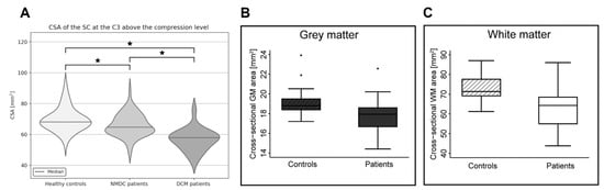 Figure 2. Significant reduction of the cross-sectional area (CSA) above the stenosis level. (A) Spinal cord (SC) CSA reduction at the C3 level, between NMDC and DCM patients, relative to healthy controls. Asterisk symbols (*) indicate significant difference between groups. Adapted with permission from Ref. [5] under creative common license; (B) Grey and (C) white CSA reduction at C2/3 level, between DCM patients and HC. Adapted with permission from Ref. [37] under creative common license.