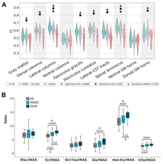 Figure 3. Group differences between NMDC and DCM patients, relative to healthy controls (HC). (A) Between-group differences in the f1 diffusion metric (i.e., primary partial volume fraction of the ball-and-sticks model) at C3, above the compression level. Adapted with permission from Ref. [5] under creative common license. (B) Between-group difference in neurometabolies ratios, gained from single-voxel magnetic resonance spectroscopy (1H-MRS) from above the compression level C2/3. Asterisk symbols (*) indicate significant difference between groups. Adapted with permission from Ref. [29] under creative common license.