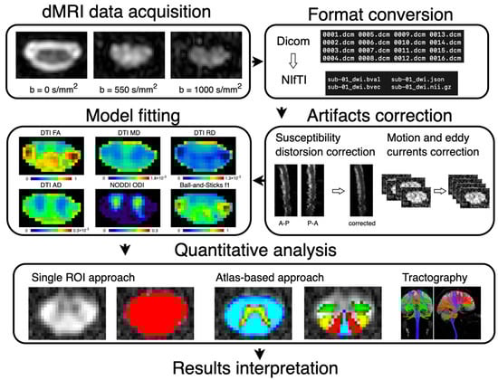 The advent of the Spinal Cord Toolbox (SCT) [121] now allows for robust automatic segmentation of the SC and GM [124,125] and the processing of structural and qMRI images, as well as utilizing the probabilistic template and PAM50 atlas [41,120]. Alternative packages, such as FMRIB Software Library (FSL) [126], Statistical Parametric Mapping (SPM) software package [127], or JIM (http://www.xinapse.com, accessed on 15 January 2022), designed for brain analysis or dedicated libraries, such as Dipy [128] or LCmodel [129], for dMRI and MRS analysis, respectively, can also be used for SC data processing. Usually, a combination of tools is used to facilitate multimodal qMRI analysis; for example, SCT is utilized for automatic SC and GM segmentations, morphometric metrics extraction, and registration of PAM50 atlas, and it is supplemented by FSL or Dipy, which provide tools for fMRI analysis and the estimation of higher-order diffusion models. Note that anatomy altered by compression can negatively influence image acquisition and data processing, and it is, thus, necessary to perform quality checks, potential manual correction of segmentation, and adjustment of processing parameters (e.g., type of registration). Typical dMRI workflow is summarized in Figure 4.