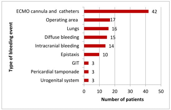 - Oude Lansink-Hartgring, A.; de Vries, A.J.; Droogh, J.M.; van den Bergh, W.M. Hemorrhagic complications during extracorporeal membrane oxygenation—The role of anticoagulation and platelets. J. Crit. Care 2019, 54, 239–243. [Google Scholar] [CrossRef] [PubMed]