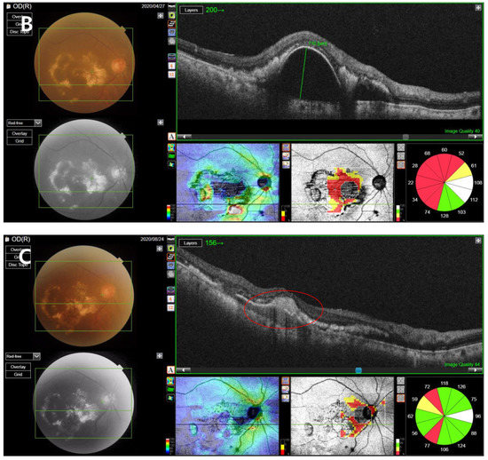 SS-OCT was performed on the enrolled eyes of all included patients using a swept-source DRI OCT Triton Plus (Topcon Co., Tokyo, Japan) at each follow-up point. Using the OCT scans, we recorded the central subfield thickness (CST) and any anatomical abnormalities including accumulated levels of subretinal fluid (SRF), intraretinal fluid (IRF), and subretinal hyperreflective material (SHRM) and presence of pigment epithelial detachment (PED), and measured the maximum height of the SRF and PED. CST, which refers to the average retinal thickness within a 1-mm-diameter ring based on the macula [19], was measured using built-in optical software (IMAGEnet 6 version 1.25.16650; Topcon Co., Tokyo, Japan). Anatomical abnormalities in OCT images, such as the levels of SHRM, SRF, PED, and IRF, were found to indicate exudative disease activity [20,21,22]. For patients with confirmed SRF accumulation or PED, the maximum SRF height (distance between the outer retina and the hyperreflective line of the RPE) was manually measured using the caliper tool in IMAGEnet software; a similar process was repeated to measure the maximum PED height (distance between the inner surface of the Bruch membrane and the outer surface of the RPE) by reviewing the OCT image [23,24] (Figure 1).