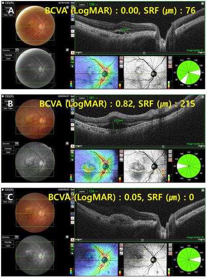 In this study, patients with SRF accumulation were compared to patients without SRF accumulation at baseline, and those with a higher baseline maximum SRF height showed less deterioration of maximum SRF height at 6 months after follow-up (Table 4 and Table 5). The reason for this has not been clarified, but the following has been presumed. First, the injection interval before and after the delayed injection was shorter in patients with baseline SRF accumulation than in patients without any baseline increase in the SRF amount. In the case of patients with baseline SRF accumulation, it is highly likely that these patients had tolerable levels of SRF despite being continuously treated with intravitreal anti-VEGF injection [38]. Alternatively, the reason may be poor or no response to intravitreal anti-VEGF injections [39]. In this case, the injection drug can be changed, the treatment regimen can be switched to T&E, or the injection interval can be shortened, all while ensuring frequent follow-up observations [27,39]. In this study, the average injection interval of patients with SRF accumulation at baseline was 2.69 ± 1.17 months, and that of patients without SRF accumulation was 3.53 ± 1.67 months, and the injection interval of patients with baseline SRF accumulation was significantly shorter (p = 0.03, independent t-test). A similar trend was shown even after the treatment delay, and the injection interval was significantly shorter in patients with baseline SRF accumulation (1.99 ± 0.67 months in patients with baseline SRF accumulation, and 3.03 ± 2.01 months in patients without baseline SRF accumulation; p = 0.008, independent t-test). Therefore, it is possible that the short injection interval of patients with baseline SRF accumulation caused the increase in SRF levels to be relatively slow. Second, in patients with baseline SRF accumulation, although not statistically significant, the maximum SRF height at baseline was negatively correlated with the injection interval before and after the treatment delay (R = −0.262 before delayed injection and R = −0.343 after delayed injection; p = 0.140 and 0.051, respectively, Pearson’s correlation analysis). In other words, the higher the baseline maximum SRF height, the more severe the disease activity, and thus, the shorter the injection interval. Therefore, the shorter injection interval possibly had the effect of slowing down the deterioration of SRF height even after the injection was delayed due to COVID-19.