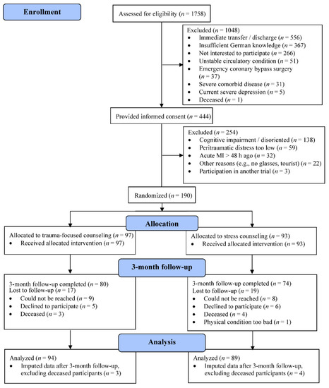 - Meister, R.; Princip, M.; Schmid, J.-P.; Schnyder, U.; Barth, J.; Znoj, H.; Herbert, C.; von Känel, R. Myocardial Infarction—Stress PRevention INTervention (MI-SPRINT) to reduce the incidence of posttraumatic stress after acute myocardial infarction through trauma-focused psychological counseling: Study protocol for a randomized controlled trial. Trials 2013, 14, 329. [Google Scholar] [CrossRef][Green Version]