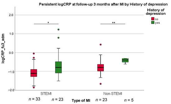 The decrease of high log CRP values at 3-month follow-up compared to admission after myocardial infarction (MI) (fu3_adm), in both the group with ST-elevation MI (STEMI) and with non-STEMI. t-test for significant group differences: * p < 0.05; ** p < 0.01.