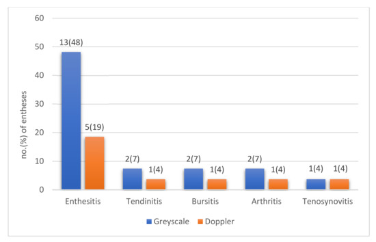 - D’Agostino, M.-A.; Said-Nahal, R.; Hacquard-Bouder, C.; Brasseur, J.-L.; Dougados, M.; Breban, M. Assessment of peripheral enthesitis in the spondylarthropathies by ultrasonography combined with power Doppler: A cross-sectional study. Arthritis Rheum. 2003, 48, 523–533. [Google Scholar] [CrossRef] [PubMed]