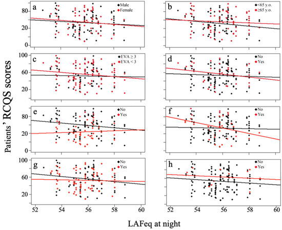 Correlation between patient RCSQ scores and LAFeq at nighttime depending on the covariables; (a) gender, (b) age, (c) VAS ≥ 3 during 2 or more hours, (d) urgent surgery, (e) hypnotic drug administration, (f) nasogastric tube, (g) water intake and (h) family visit.